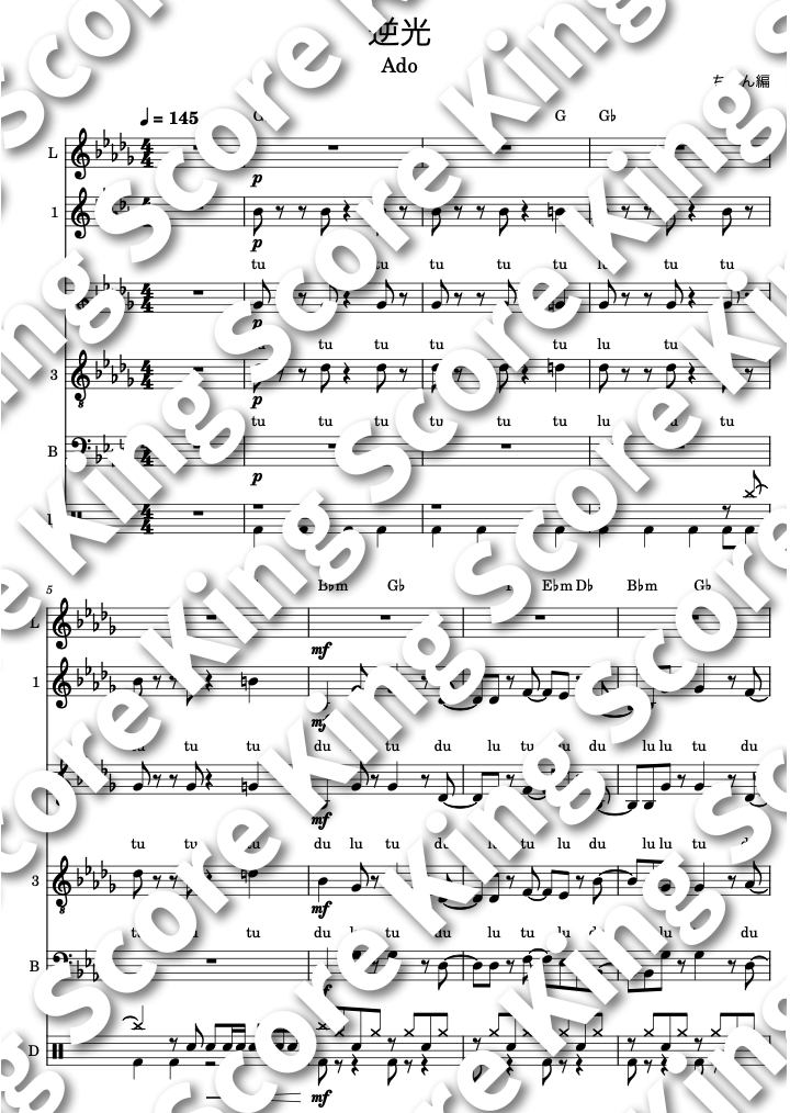 | パート | Lead:女性 1st Chorus:女性 2nd Chorus:女性 3rd Chorus:男性 Bass:男性 Perc.:男/女性 |